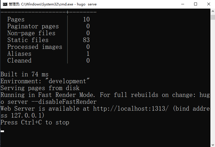 直到命令面板显示这些提示时,说明我们的站点已经成功启动了,然后我们就可以通过浏览器来访问我们的站点,站点地址界面信息已经给出,是http://localhost:1313,是一个本地的浏览地址,我们打开浏览器,地址栏里输入http://localhost:1313看一下效果。