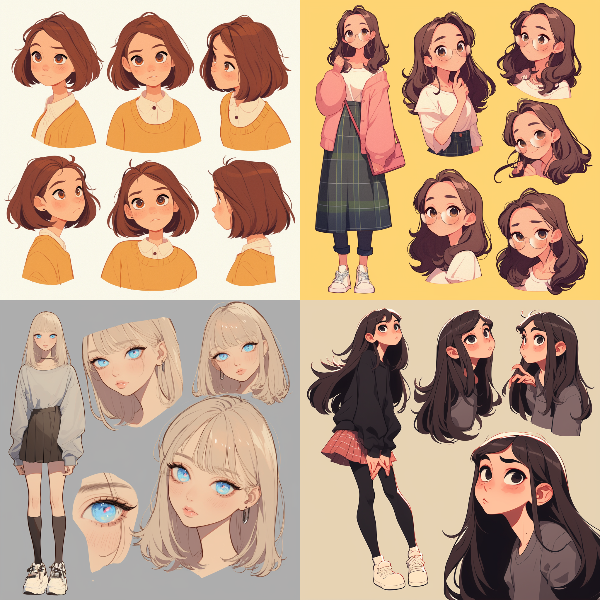 Prompt: Character pose sheet, a girl, big eyes --niji 6